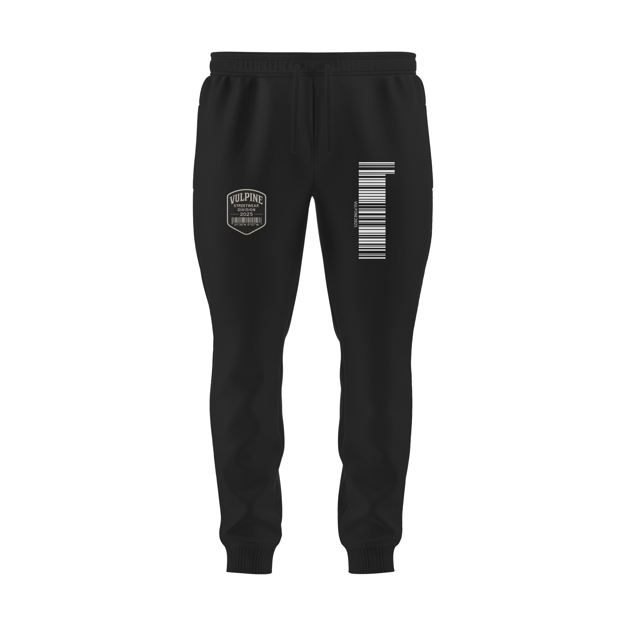 The design features a crisp vertical barcode graphic paired with VULPINE branding, inspired by industrial labels and modern techwear culture. Perfect for pairing with hoodies, oversized tees, or performance layers.